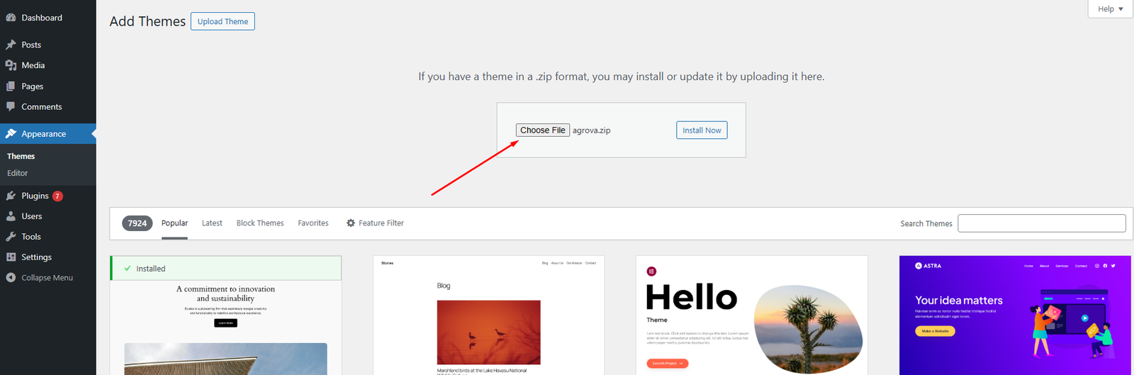 Note: When uploading your theme with the installer, please ensure you are uploading the theme .zip file, not the entire package you downloaded. In this case, you will be uploading agrova.zip