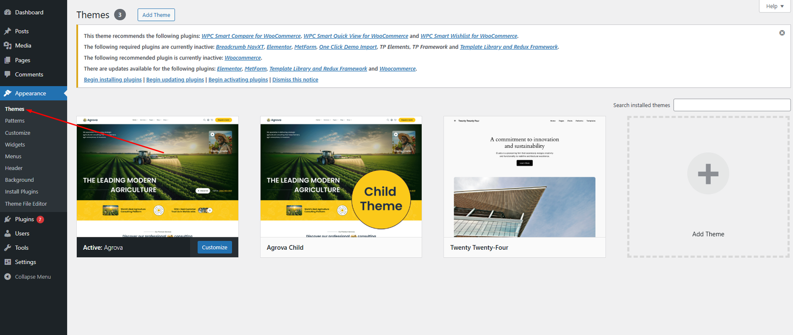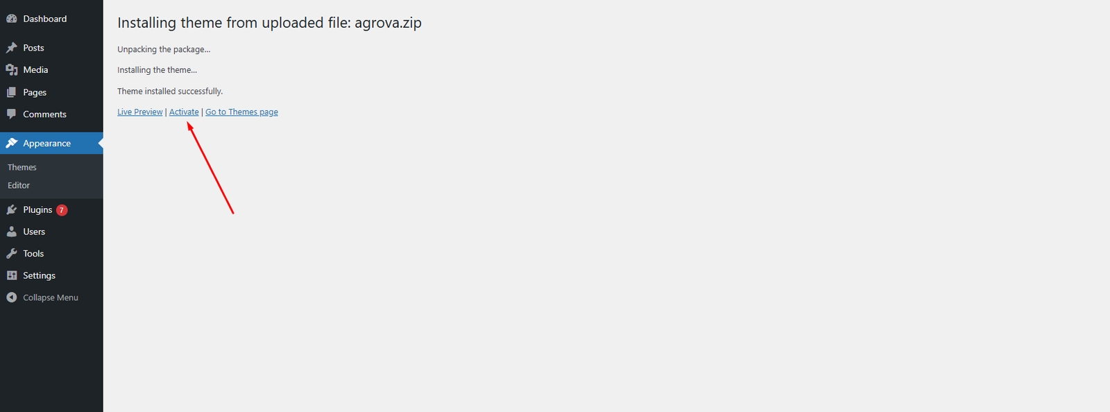 Once uploaded, activate the theme by heading to the “Themes” menu in the WordPress Dashboard. Locate the Agrova theme and hit “Activate”.