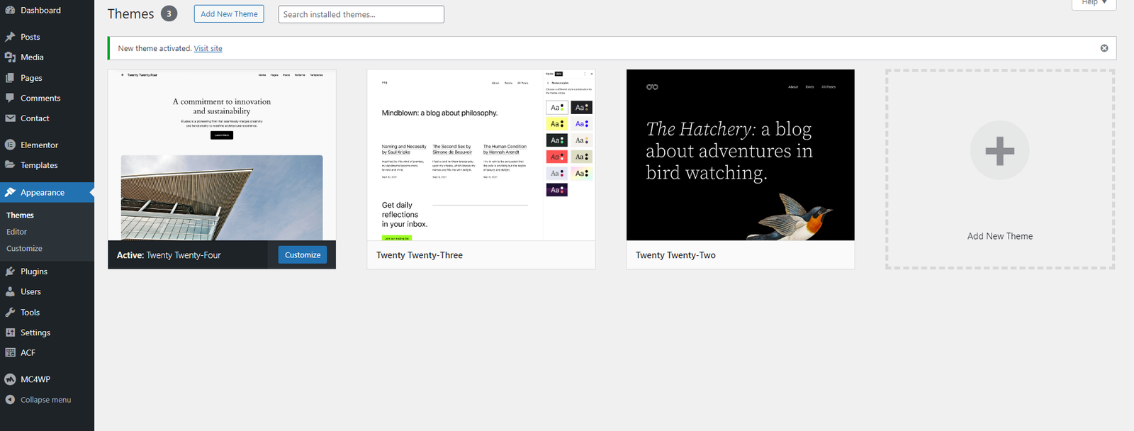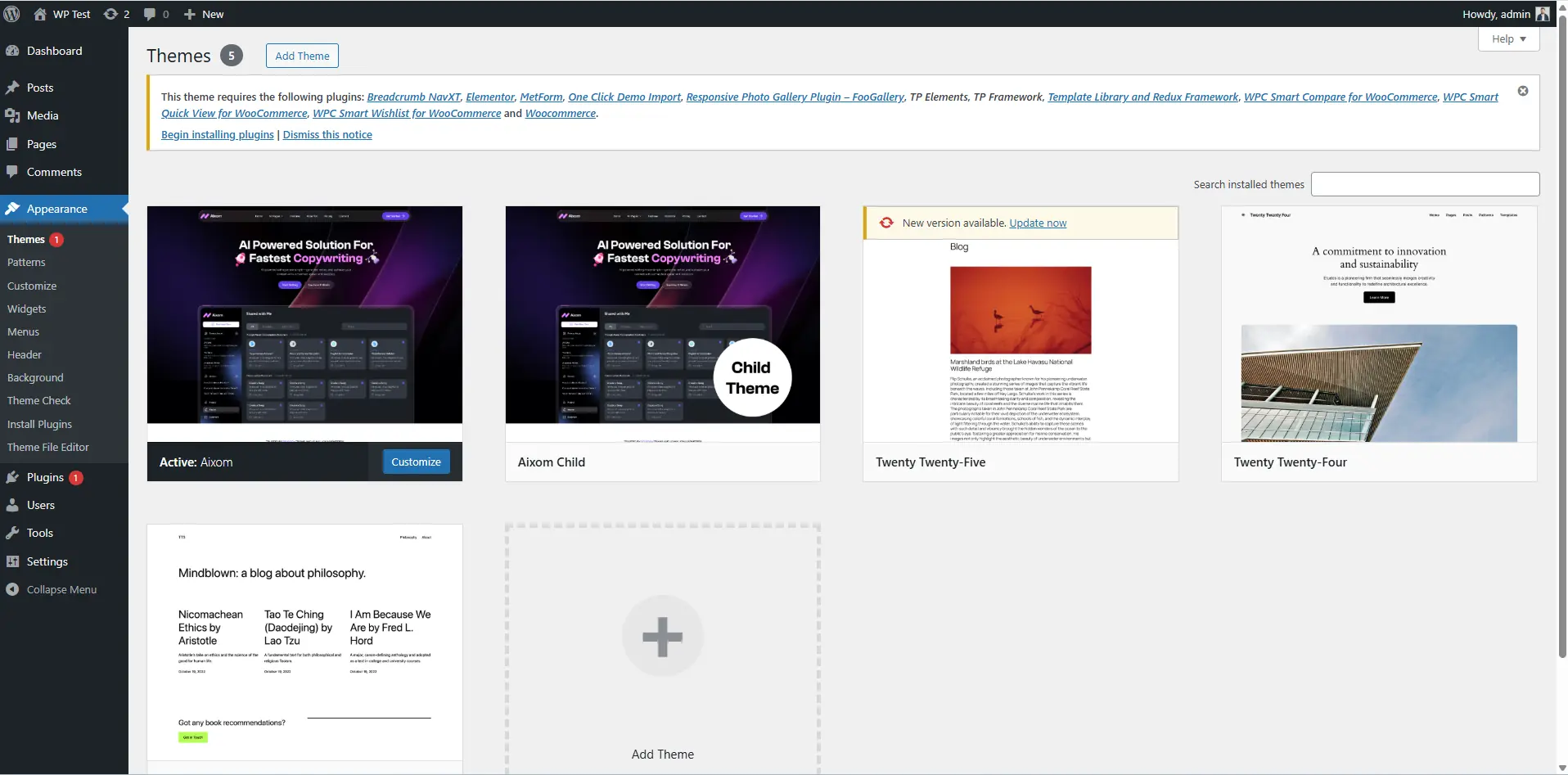 Once uploaded, activate the theme by heading to the “Themes” menu in the WordPress Dashboard. Locate the Aixom theme and hit “Activate”.
