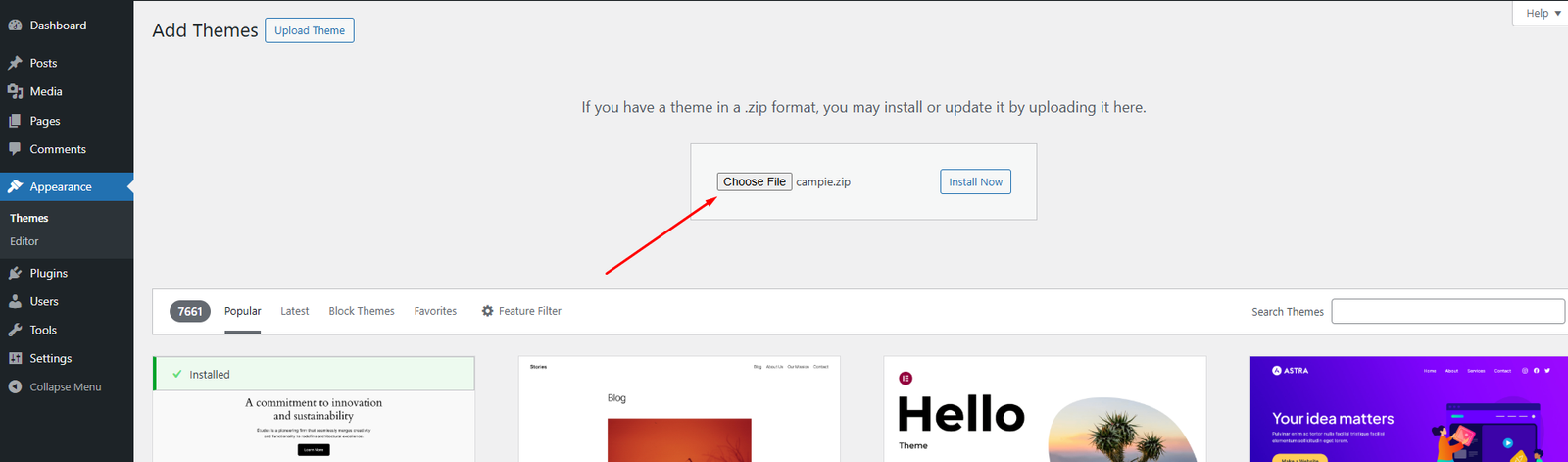 Note: When uploading your theme with the installer, please ensure you are uploading the theme .zip file, not the entire package you downloaded. In this case, you will be uploading Campie.zip