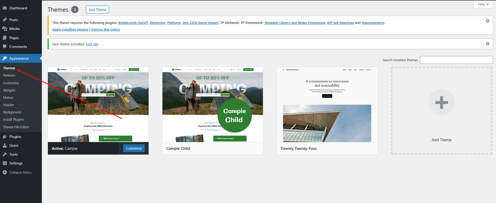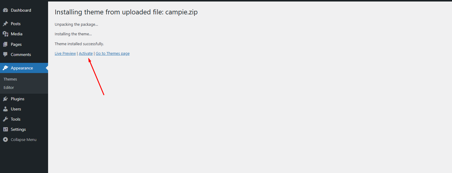 Once uploaded, activate the theme by heading to the “Themes” menu in the WordPress Dashboard. Locate the Campie theme and hit “Activate”.