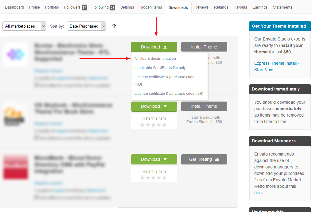When you purchase our theme from Themeforest, you need to download the Sociox files from your Themeforest account. Navigate to your downloads tab on Themeforest and find Sociox . Click the download button to see the two options. The Main Files contain everything, the Installable WordPress Theme is just the installable WordPress theme file. Below is a full list of everything that is included when you download the main files, along with a brief description of each item.