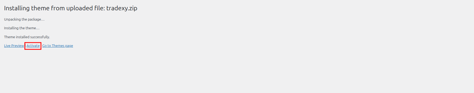 Once uploaded, activate the theme by heading to the “Themes” menu in the WordPress Dashboard. Locate the Tradoz theme and hit “Activate”.